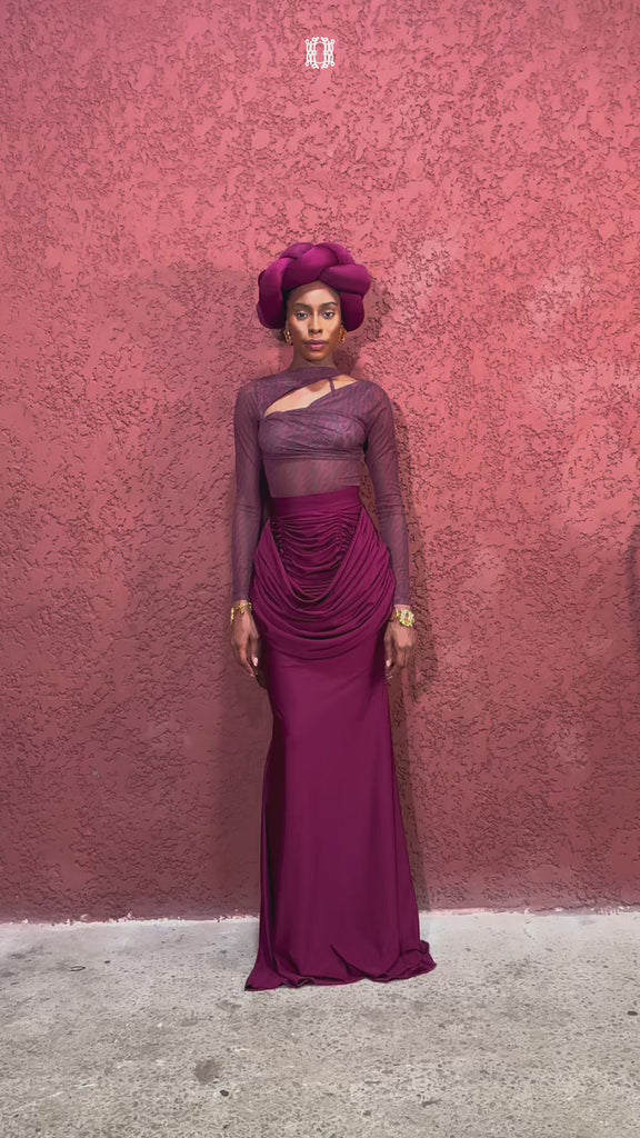 Paired with a fitted lycra skirt that sits slightly above the knee, the skirt showcases a-line shaping, double-sided ruching, and an overlay drape for added movement and architectural depth. Perfect for elevated occasions, this set balances structure, texture, and effortless style.